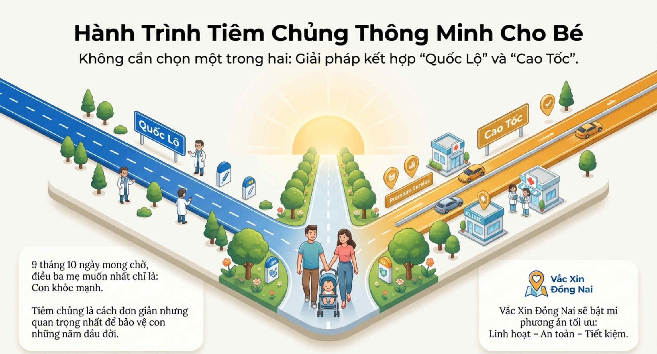 Hãy hình dung hành trình tiêm chủng của con giống như việc lựa chọn một con đường: một là "quốc lộ" quen thuộc, hai là "đường cao tốc" hiện đại. Mỗi con đường đều có những đặc điểm riêng.